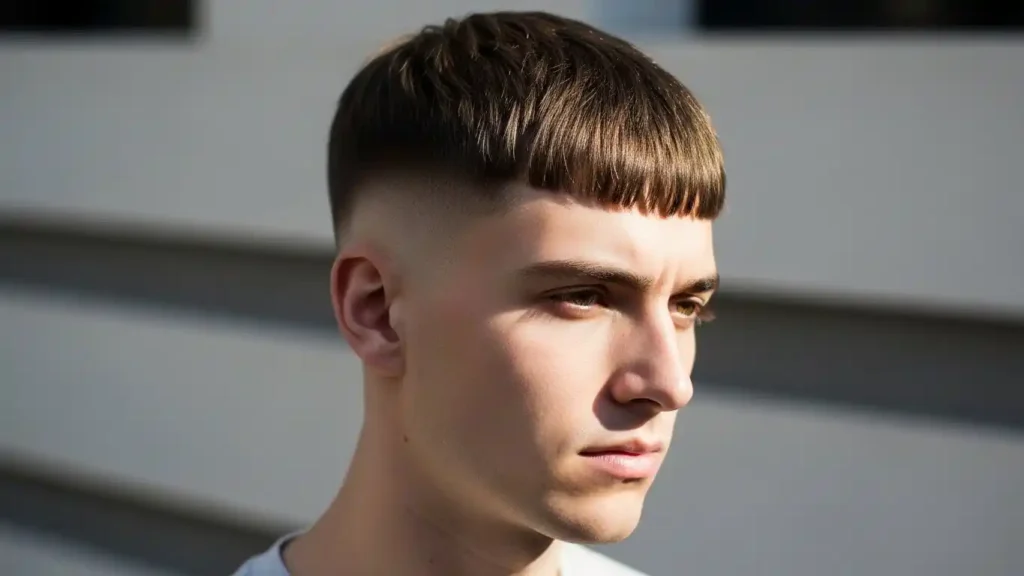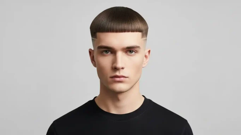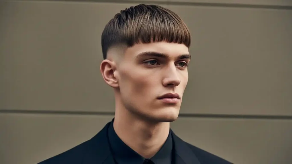 The blunt crop haircut features a straight, even fringe that creates a bold and structured appearance. This style emphasizes clean lines and symmetry, making it ideal for men who prefer a sharp, fashion-forward look. It works best with straight hair for a smooth finish.